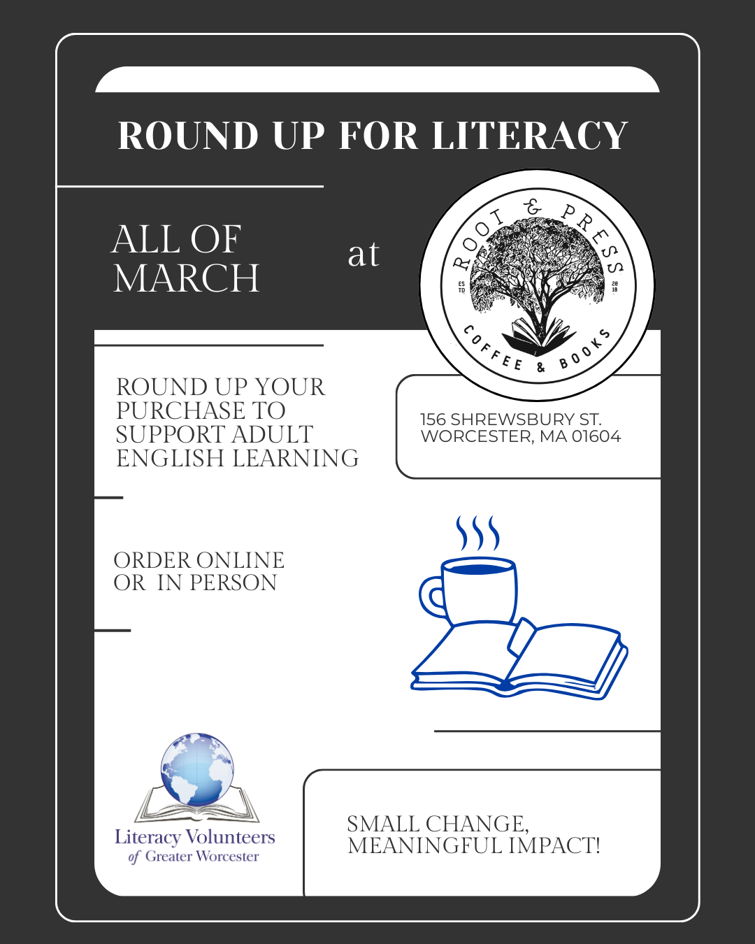 We’re proud to partner with Root and Press, bookstore and cafe located at 156 Shrewsbury Street in Worcester, for the month of February and Match! By rounding up food, beverage, and book purchases in-store or online at Root and Press, you will support our mission of empowering adults through culturally compassionate English language education—building confidence, opportunity, and community across Greater Worcester.