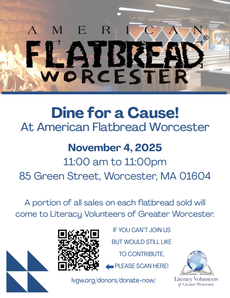 ✅ A portion of every flatbread sold goes directly to Literacy Volunteers of Greater Worcester