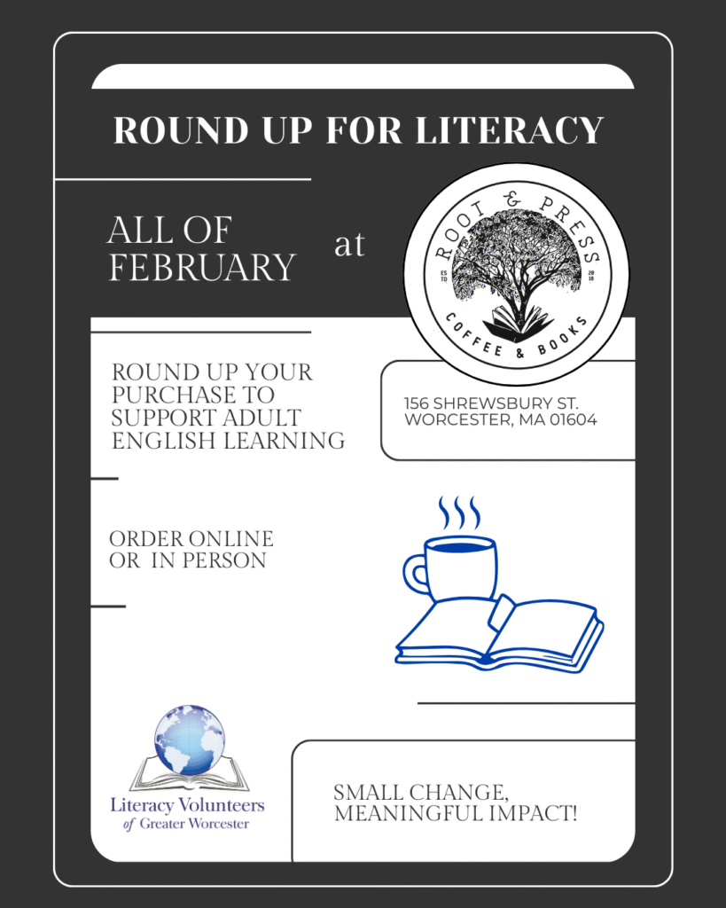 We’re proud to partner with Root and Press, bookstore and cafe located at 156 Shrewsbury Street in Worcester, for the month of February! By rounding up food, beverage, and book purchases in-store or online at Root and Press, you will support our mission of empowering adults through culturally compassionate English language education—building confidence, opportunity, and community across Greater Worcester.